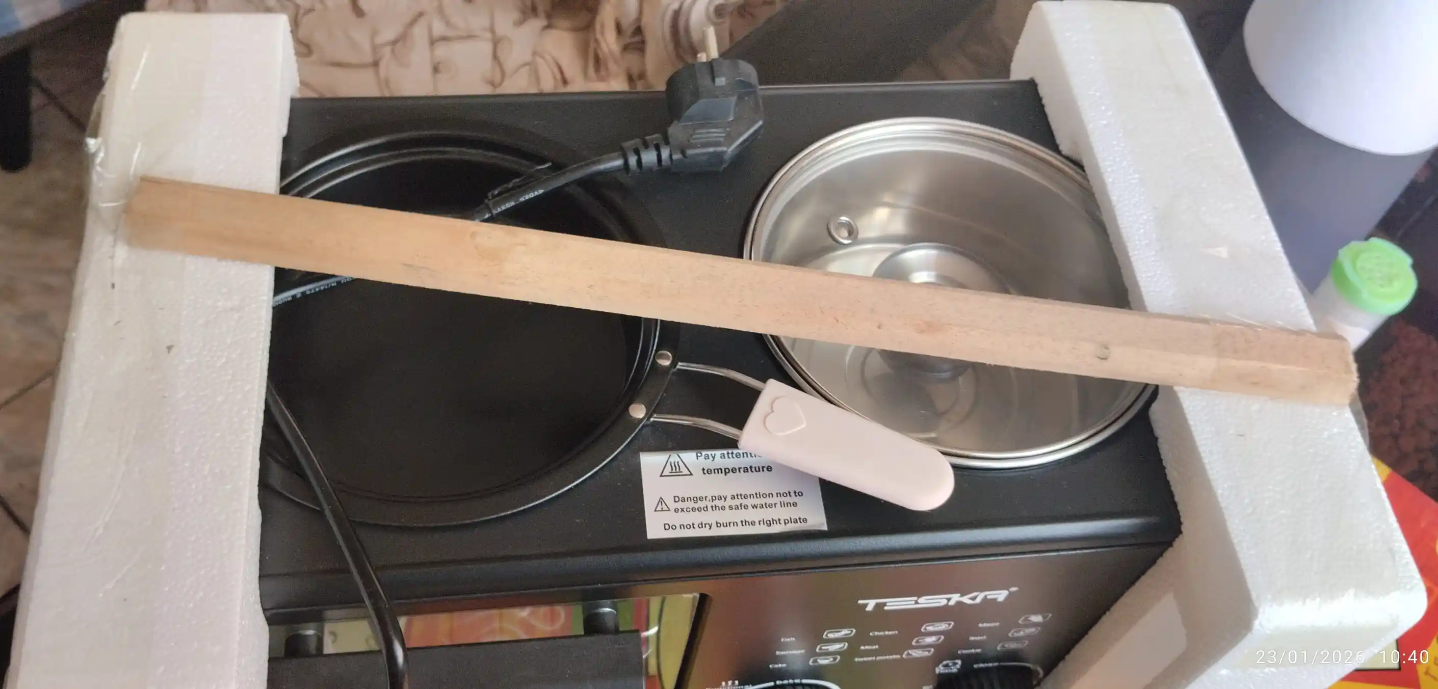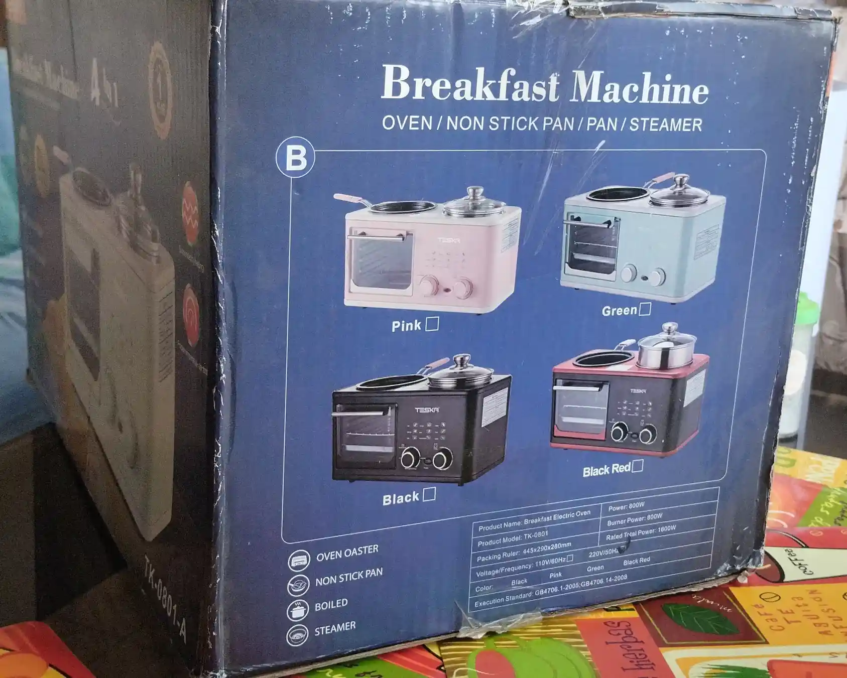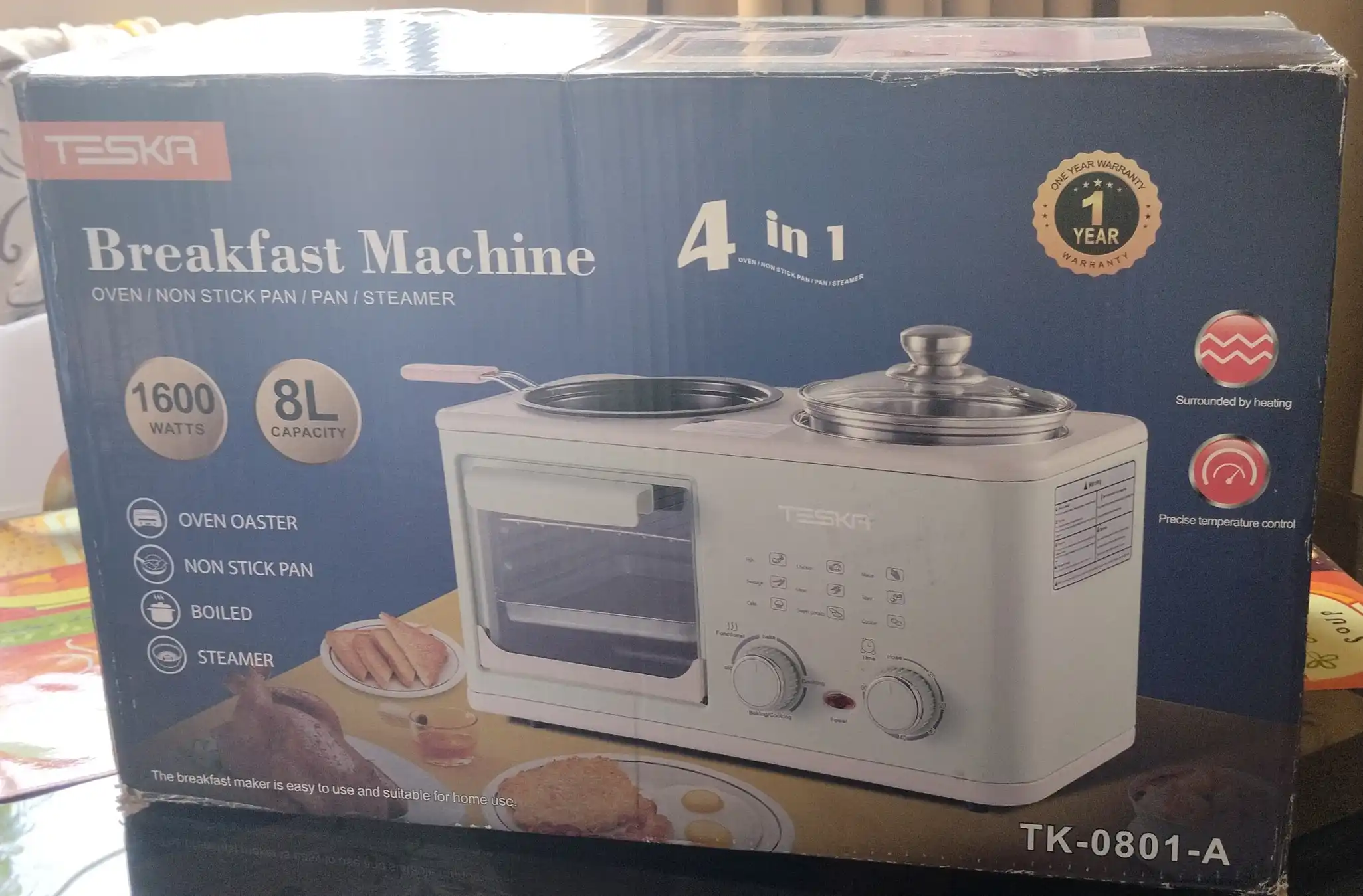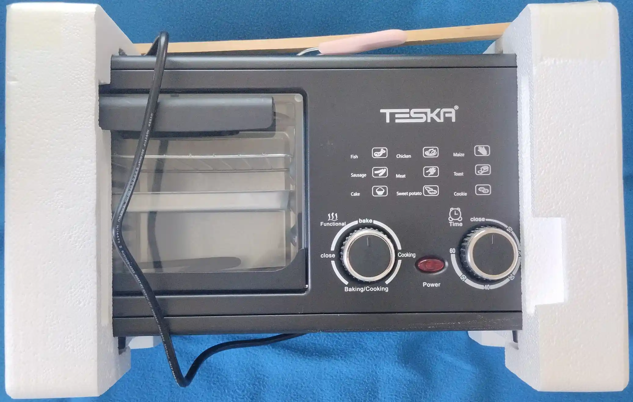 Color negro. 800W - Hornea, cocina al vapor, fríe y más. Modelo TK-0801-A. Estado: 9.9/10 (usado UNA SOLA VEZ). Embalado en caja + manual. Puerta de vidrio de alta resistencia. Ideal para 1 o 2 personas. Calienta rápido.